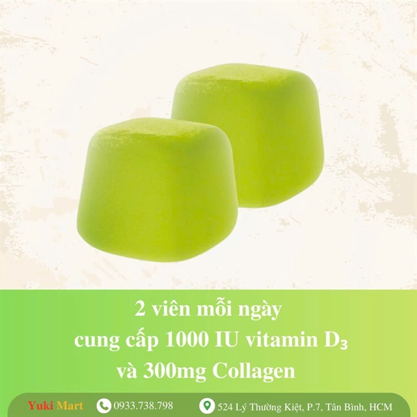 - Chỉ 2 viên mỗi ngày cung cấp 1000 IU Vitamin D₃ + 300mg Collagen.