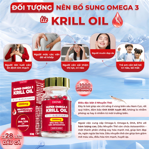 - Supper Omega 3 Krill Oil Eikenbi với hàm lượng Omega 3 lên đến 2000mg trong mỗi viên, được chiết xuất trực tiếp từ tôm Nam Cực tinh khiết.